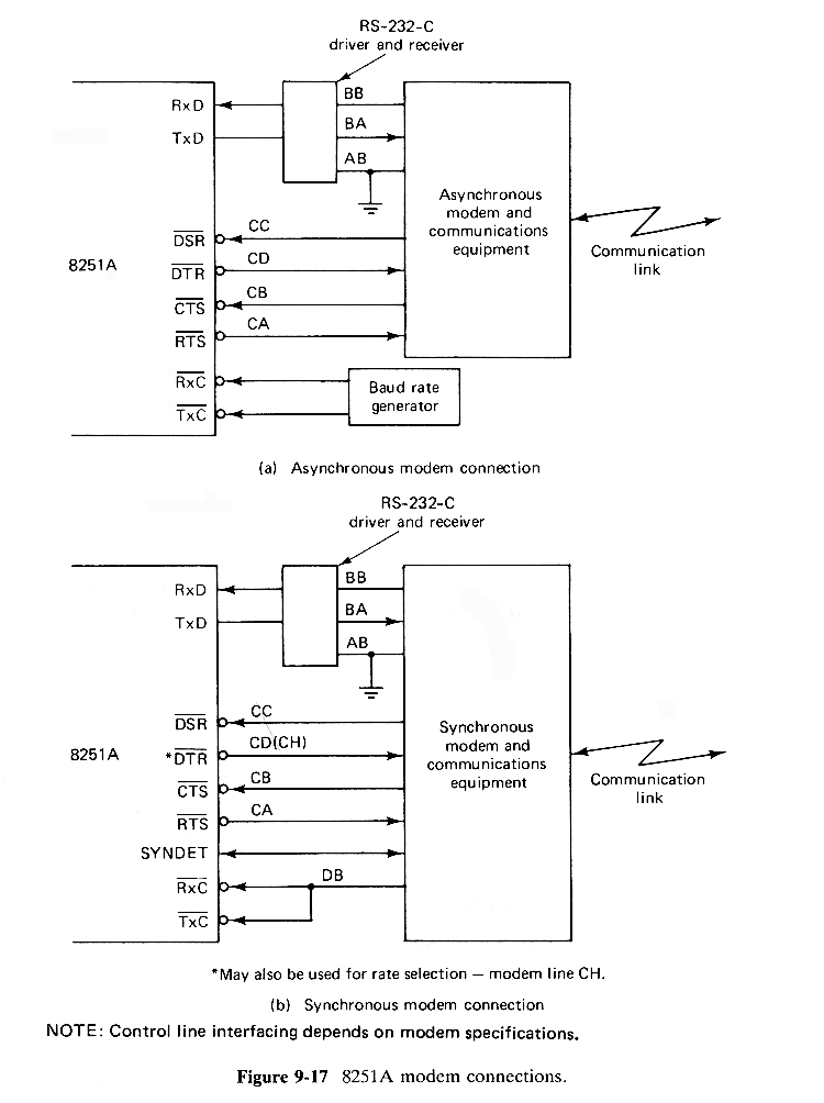 Typical connections to modems for asynchronous and synchronous transmissions are shown in Fig.9-17. With regard to the synchronous connections it is assumed that the timing is controlled by the modem and its related communications equipment.