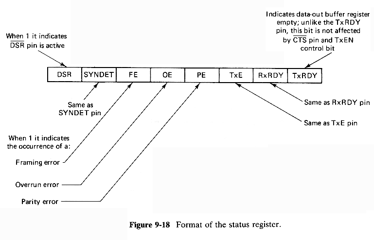 Figure 9-19 gives a typical program sequence which uses programmed I/O to input 80 characters from the 8251A, whose data buffer register's address is 0050, and put them in the memory buffer beginning at LINE.