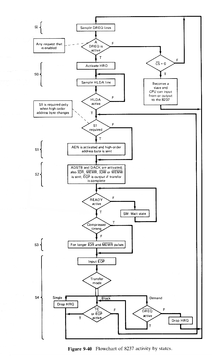 The 8237 timing can be divided into the SI,S0,S1,S2,S3,S4 and SW states. A flowchart of the timing as seen by the 8237 is given in Fig.9-40.